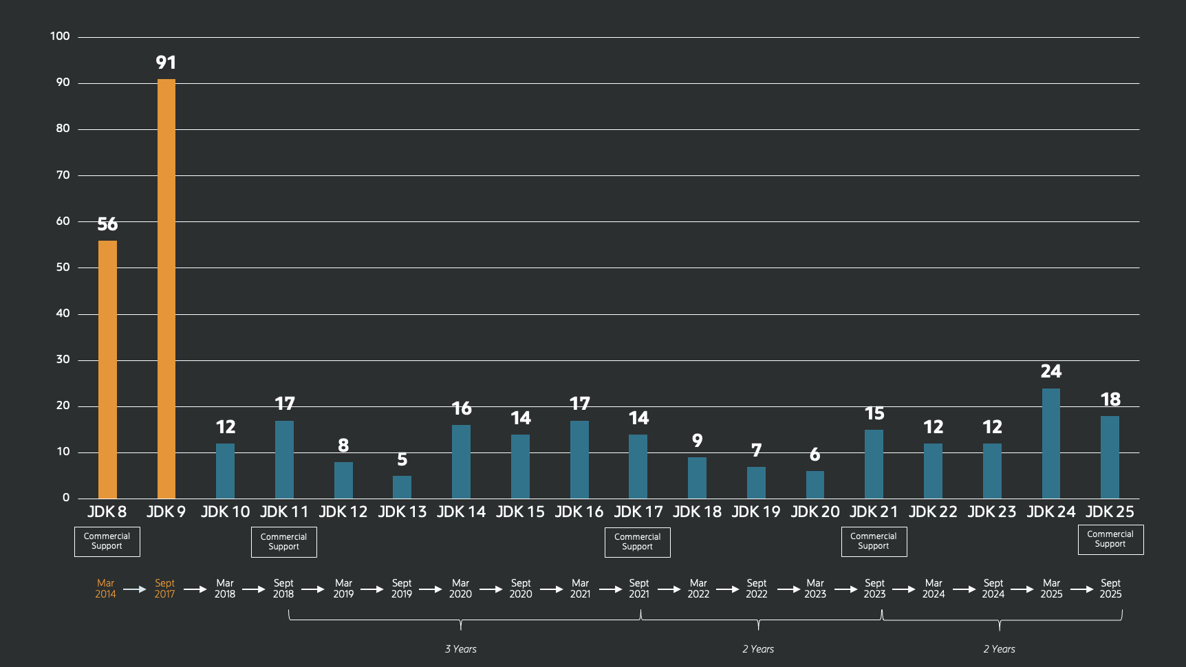 JDK 8 以来每个 Java 版本中的 JEP 数量